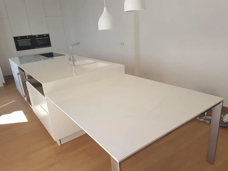 Material fabricado a partir de cuarzo natural triturado mezclado con resinas y pigmentos. Ofrece una superficie no porosa, muy higiénica y de fácil mantenimiento. Es resistente a las manchas y a los arañazos, aunque se recomienda evitar el contacto directo con fuentes intensas de calor.